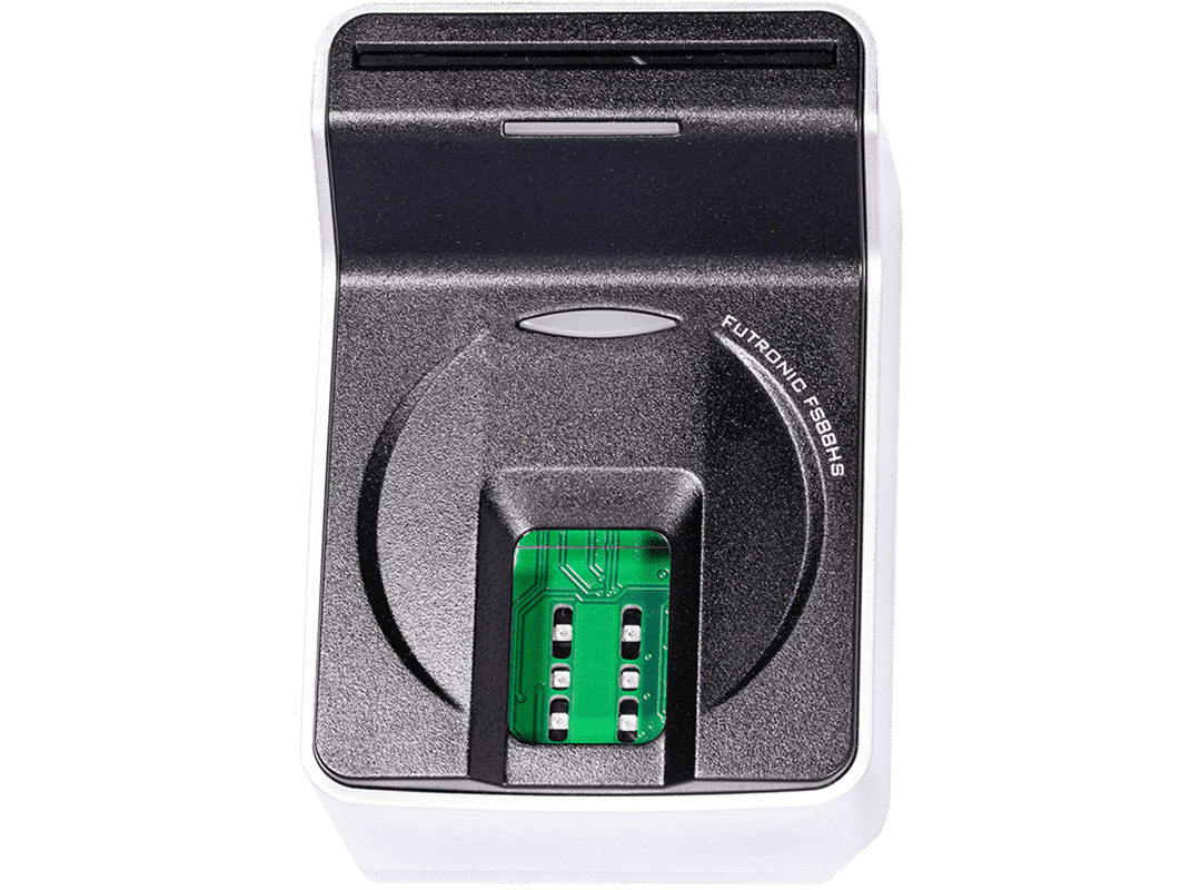 El FS88HS Futronic es un lector dactilar especializado que combina un capturador de huellas óptico certificado por el FBI (FS88H), junto con un lector/grabador de tarjetas inteligentes de contacto (SmartCard).