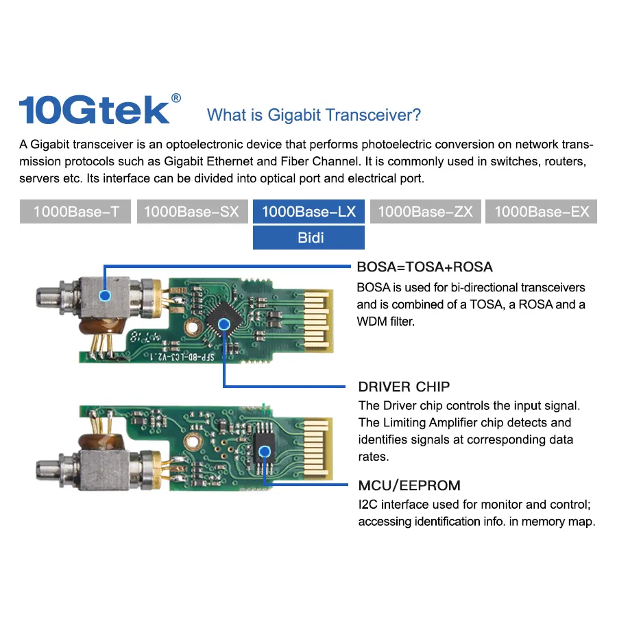 These BiDi SFP transceivers consists of Driver IC, eeprom I2C, Tx1310nm FP or Tx1550nm DFB laser, PIN-(tia)