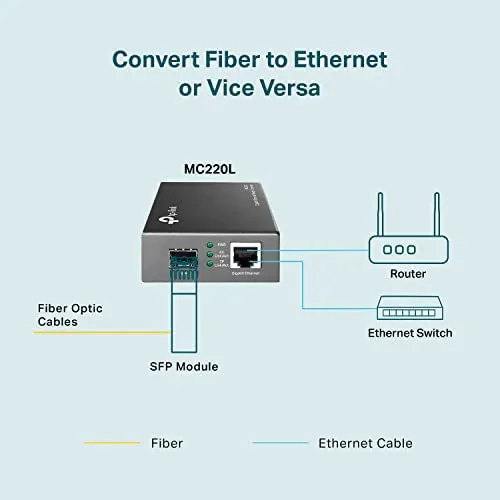 - El MC220L es un conversor de medios diseñado para convertir el cable de fibra 1000BASE-SX/LX/LH a cable de cobre 1000Base-T o viceversa. El MC220L está diseñado conforme a los estándares IEEE802.3ab, 1000Base-T, IEEE802.3z y 1000Base-SX/LX/LH. Puede usarse con cable de fibra multimodo y monomodo utilizando un conector tipo SC/LC. Funciona a 850 nm tanto en el envío como en la recepción de datos cuando se utiliza fibra multimodo y a 1310 nm tanto en el envío como en la recepción de datos cuando se utiliza fibra monomodo.